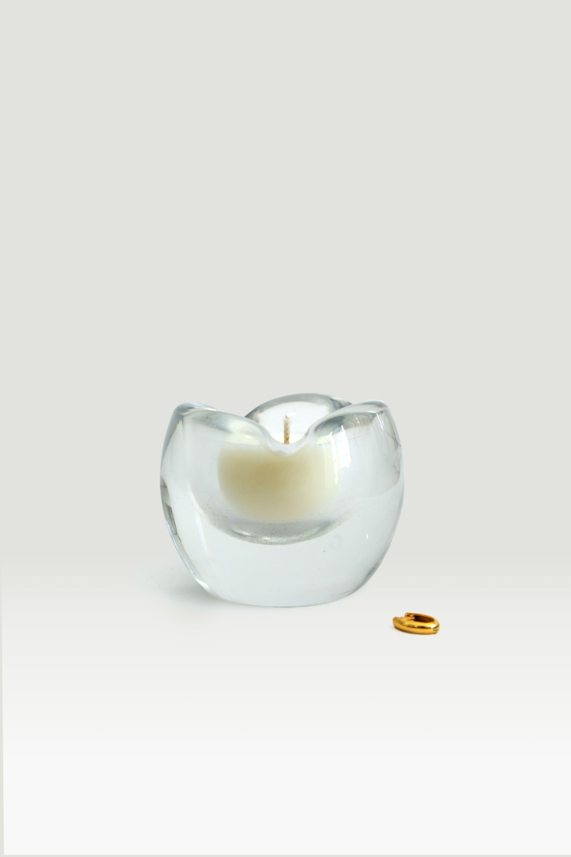 Cette bougie, coulée à Paris, repose dans un contenant signé Daum, dont la forme ronde et robuste lui confère une allure singulière.