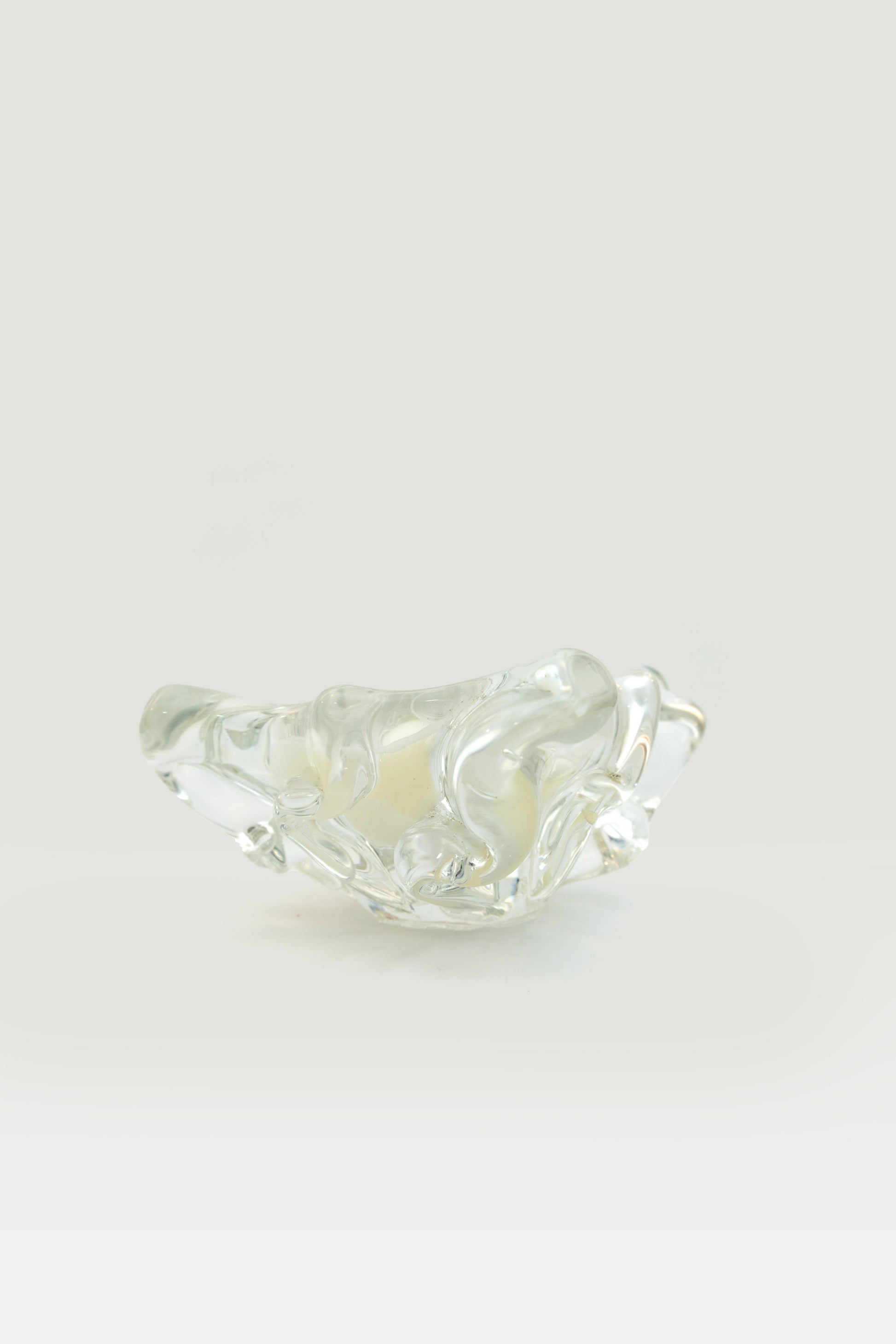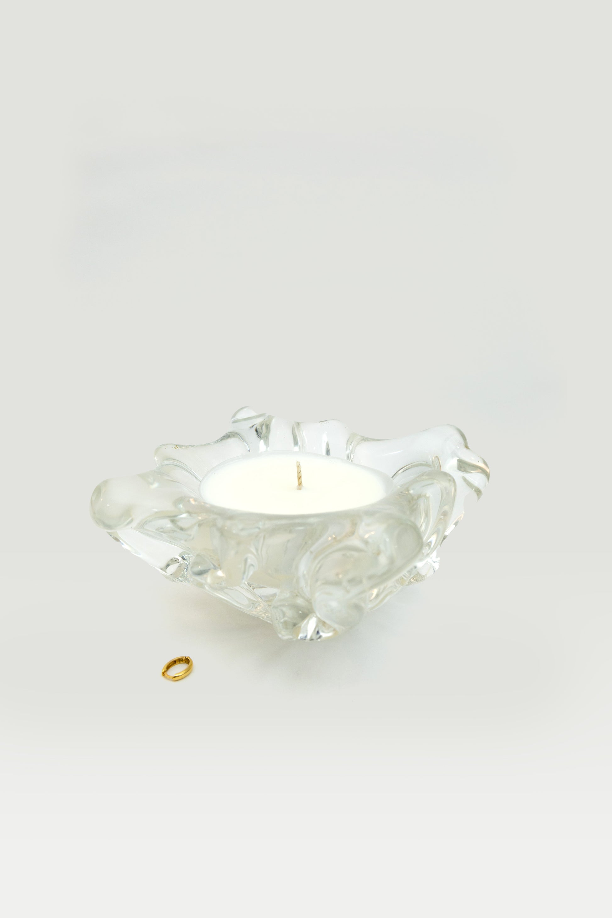Bougie dans un contenant en verre épais transparent, au design organique.
